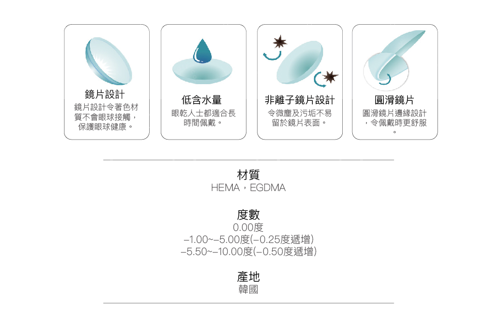 Daily|Water Content 38%|B.C 8.6mm|DIA14.2mm|G.DIA13.3mm|Material HEMA, EGDMA|Made in Korea|Packing 10pcs per box