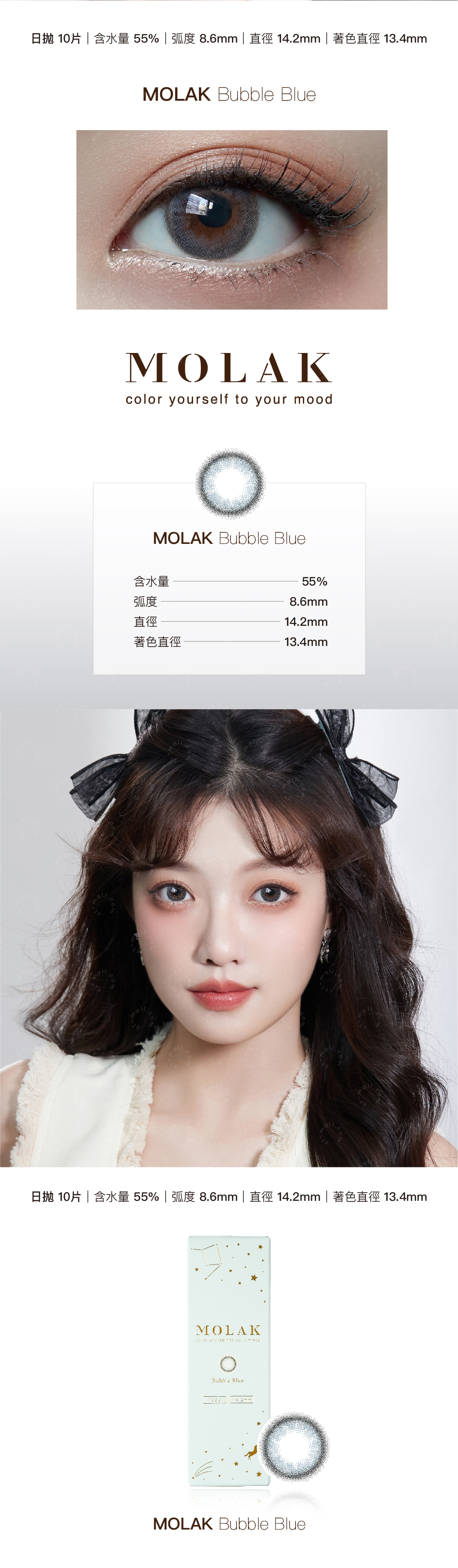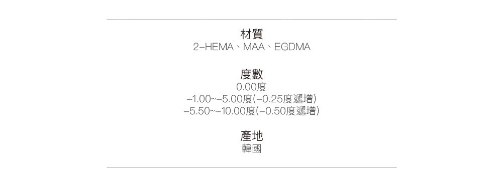 Daily|Water Content 55%|B.C 8.6mm|DIA14.2mm|G.DIA13.4mm|Material HEMA, EGDMA, MAA|Made in Korea|Packing 10pcs per box