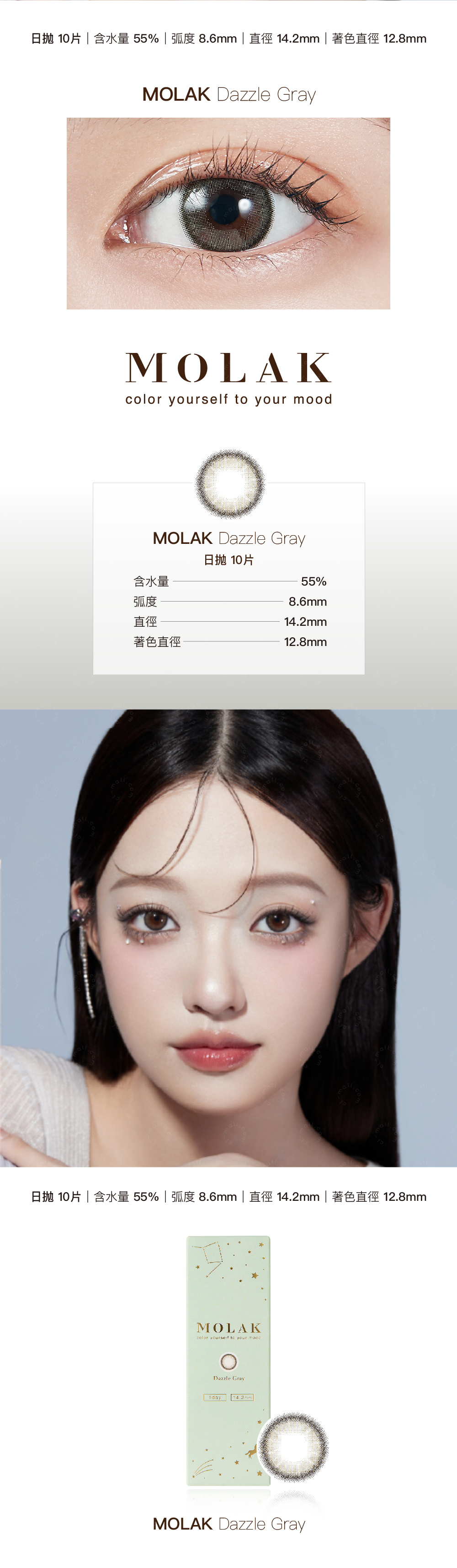 Daily|Water Content 55%|B.C 8.6mm|DIA14.2mm|G.DIA12.8mm|Material HEMA, EGDMA, MAA|Made in Korea|Packing 10pcs per box
