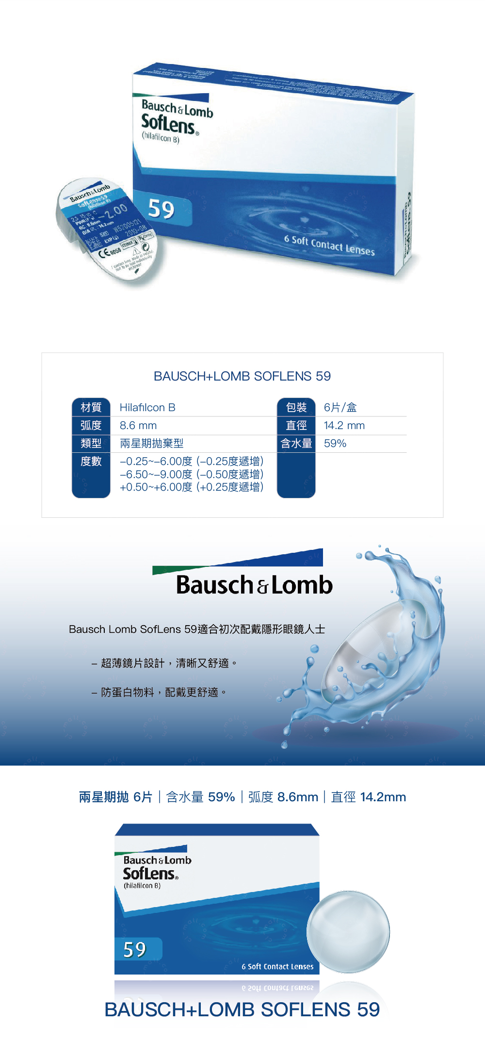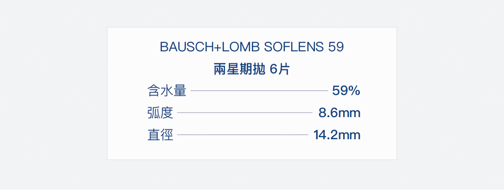 兩星期拋|含水量59%|弧度(B.C) 8.6mm|直徑(DIA)14.2mm|材質(Material) Hilafilcon B|包裝(Packing) 6片/盒