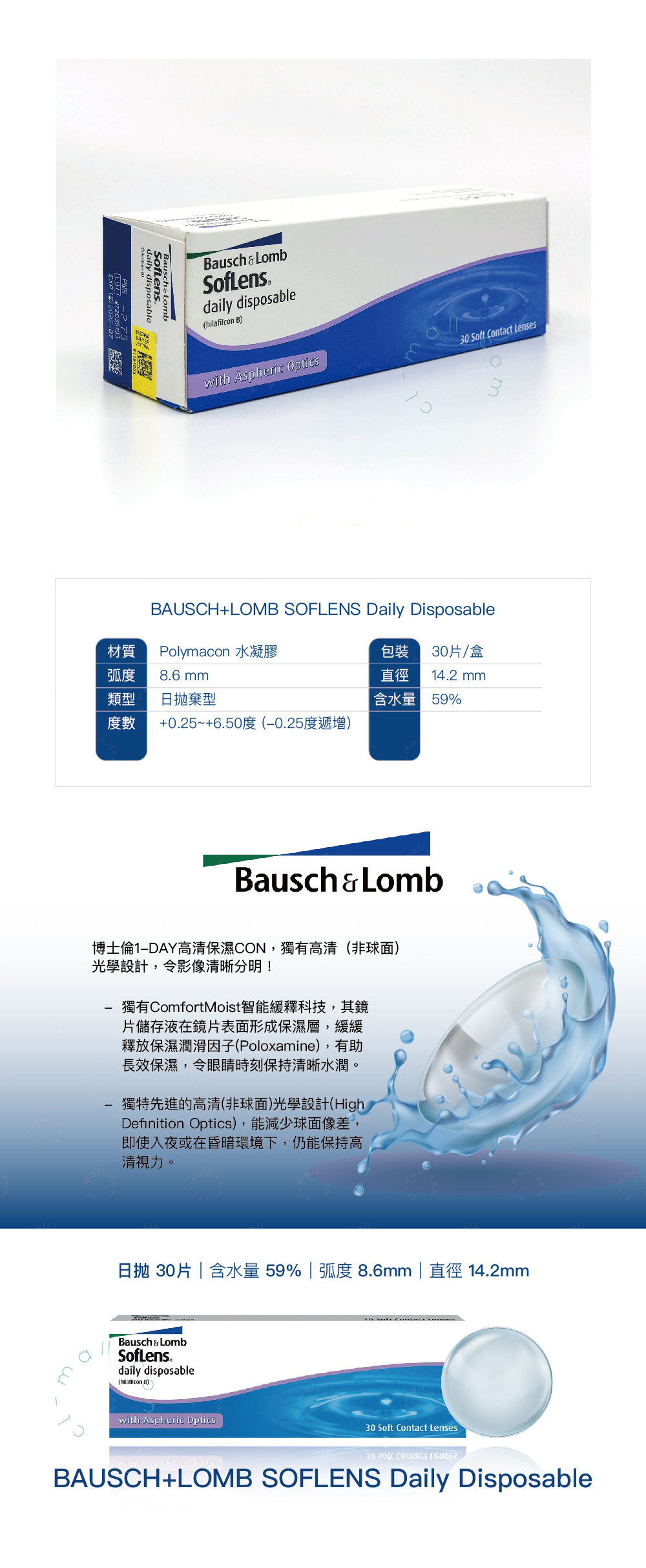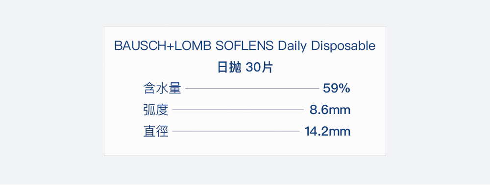日拋|含水量59%|弧度(B.C) 8.6mm|直徑(DIA)14.2mm|材質(Material) Hilafilcon B|包裝(Packing) 30片/盒