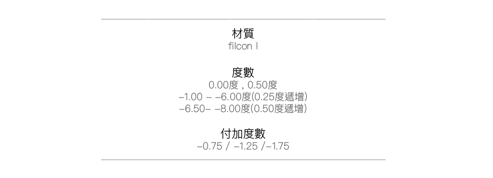 日拋|含水量42%|弧度(B.C) 8.5mm|直徑(DIA) 14.2mm|材質(Material) Filcon I|包裝(Packing) 30片/盒