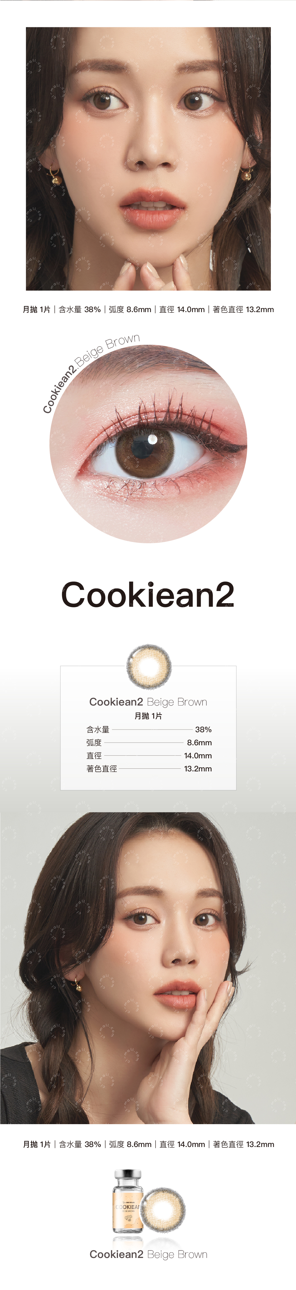 月拋|含水量38%|弧度(B.C) 8.6mm|直徑(DIA) 14.0mm|着色直徑(G.DIA)13.2mm|材質(Material) HEMA|產地韓國|包裝(Packing) 1片/瓶