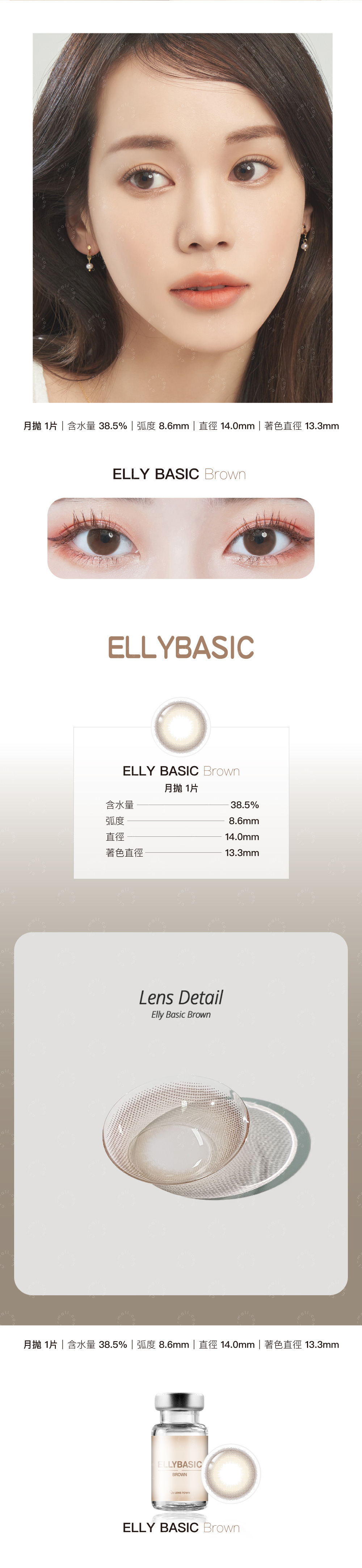 月拋|含水量38.5%|弧度(B.C) 8.6mm|直徑(DIA) 14.0mm|着色直徑(G.DIA)13.3mm|材質(Material) HEMA|產地韓國|包裝(Packing) 1片/瓶