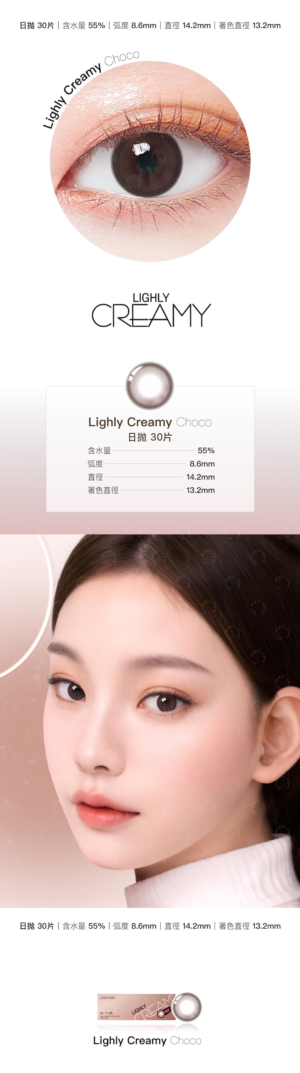 日拋|含水量55%|弧度(B.C) 8.6mm|直徑(DIA) 14.2mm|着色直徑(G.DIA)13.2mm|材質(Material) PHEMA|產地韓國|包裝(Packing) 30片/盒