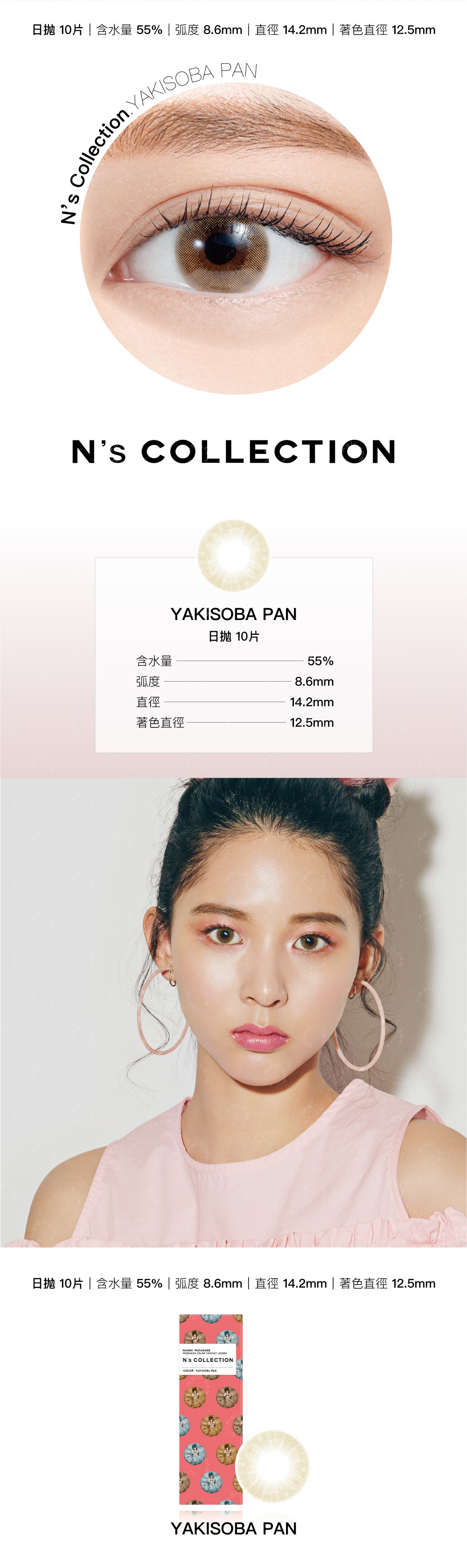 日拋|含水量55%|弧度(B.C) 8.6mm |直徑(DIA) 14.2mm|着色直徑(DIA) 12.5mm|材質(Material) HEMA, EGDMA, MAA|包裝(Packing) 10片/盒