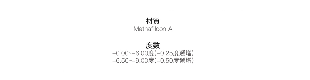 日拋|含水量55%|弧度(B.C) 8.6mm|直徑(DIA)14.2mm|着色直徑(G.DIA)12.9mm|材質(Material) Mathafilcon A |包裝(Packing) 30片/盒