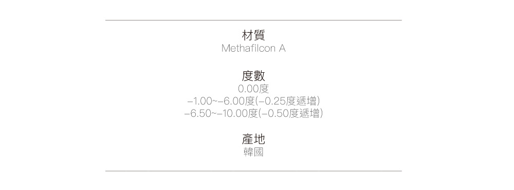 日拋|含水量55%|弧度(B.C) 8.6mm|直徑(DIA) 14.2mm|着色直徑(G.DIA)12.9mm|材質(Material) Methafilcon A|產地韓國|包裝(Packing) 30片/盒