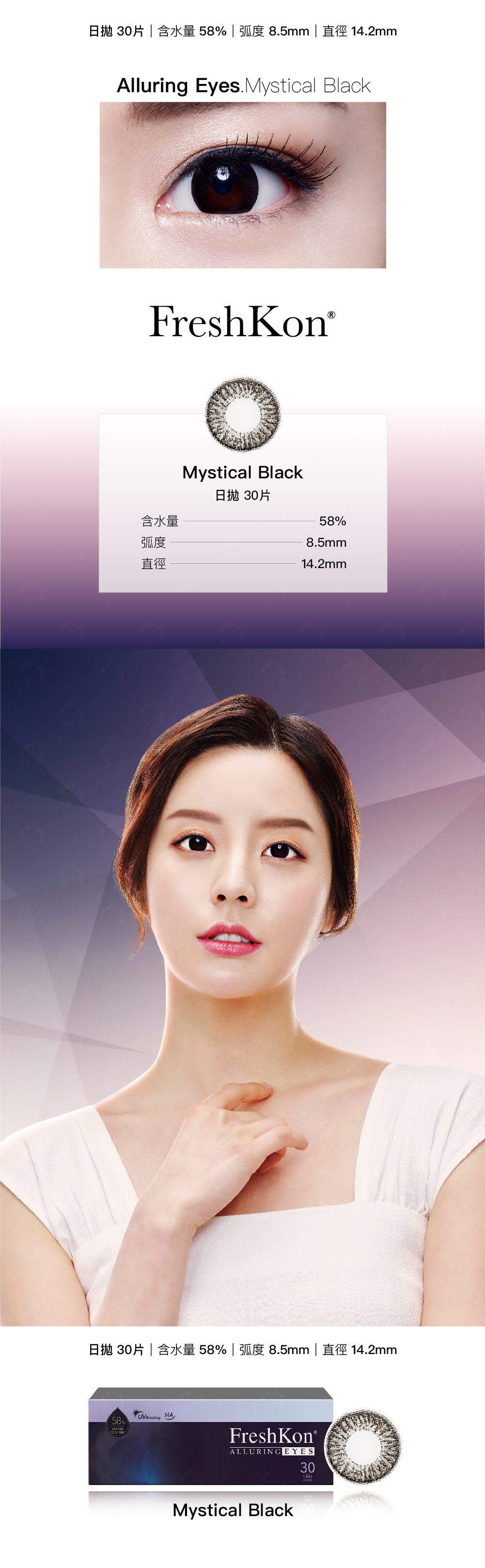 日拋|含水量58%|弧度(B.C) 8.5mm|直徑(DIA) 14.2mm|材質(Material) Etafilcon A|包裝(Packing) 30片/盒