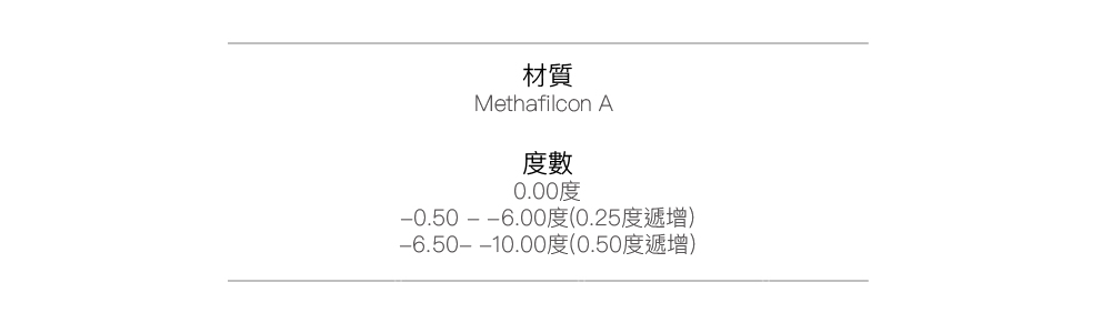 月拋|含水量55%|弧度(B.C) 8.6mm|直徑(DIA) 14.2mm|材質(Material) Methafilcon A|包裝(Packing) 2片/盒
