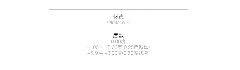 日拋|含水量47%|弧度(B.C) 8.8mm|直徑(DIA) 14.1mm|着色直徑(G.DIA) 13.4mm|材質(Material) Olifilcon B|包裝(Packing) 10片/盒