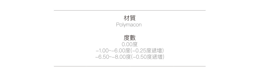 半年拋|含水量40%|弧度(B.C) 8.7mm|直徑(DIA) 14.5mm|材質(Material) Polymacon|包裝(Packing) 1片/瓶