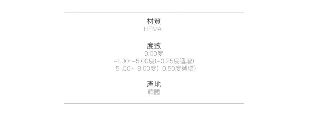 月拋|含水量40%|弧度(B.C) 8.6mm|直徑(DIA) 14.2mm|着色直徑(G.DIA)13.8mm|材質(Material) PHEMA|產地韓國|包裝(Packing) 2片(同度數)/盒